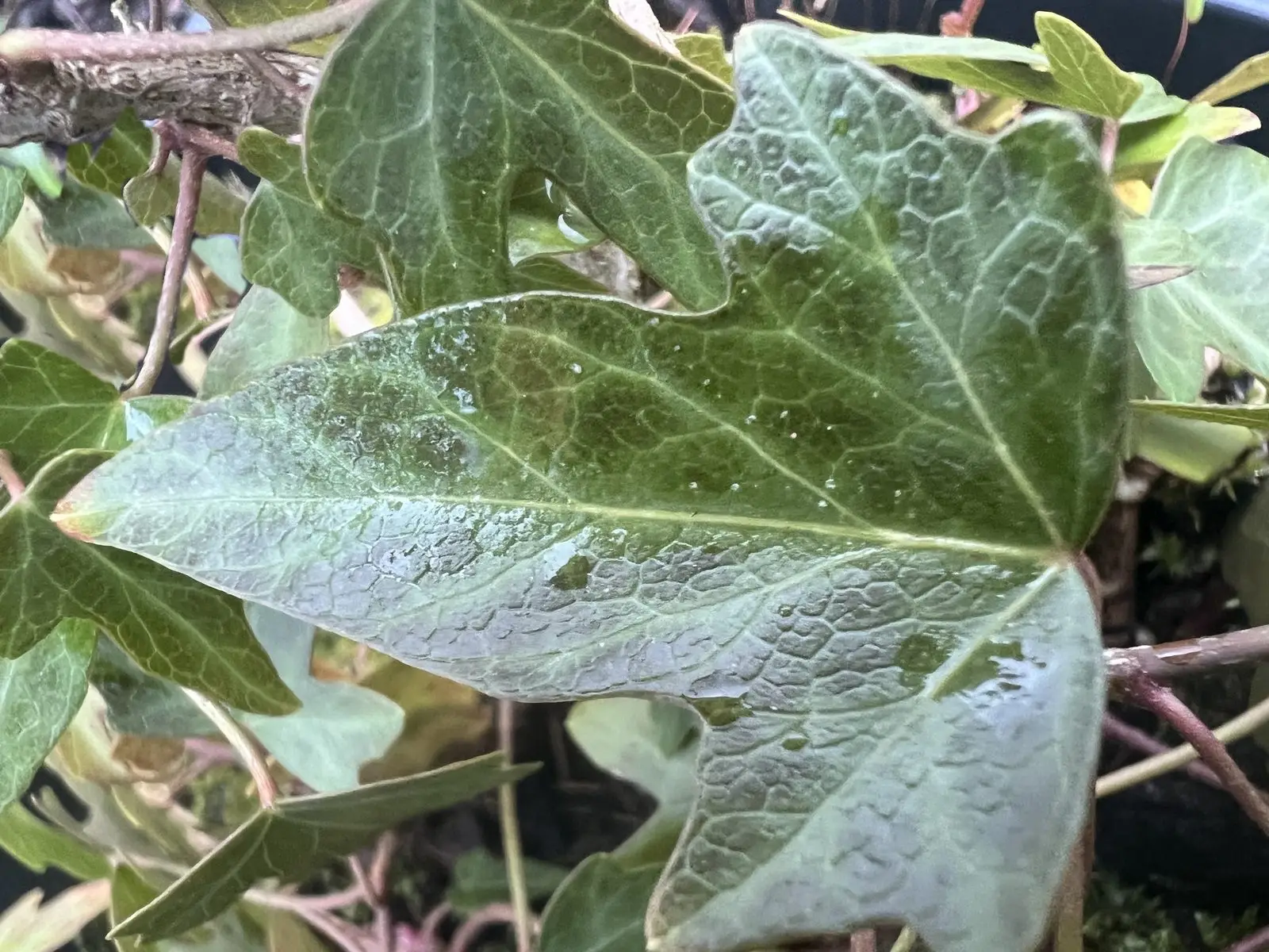 Es ist der Stress, der die Verfärbungen verursacht. Vermutlich erhält Ihr Efeu zum Beispiel nicht genug Kälte.