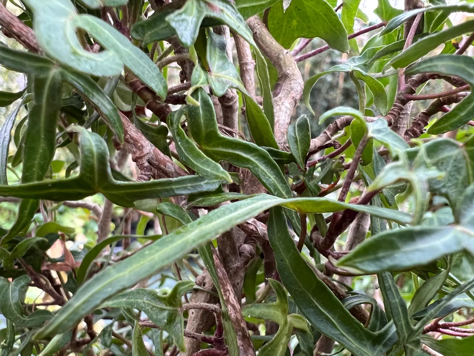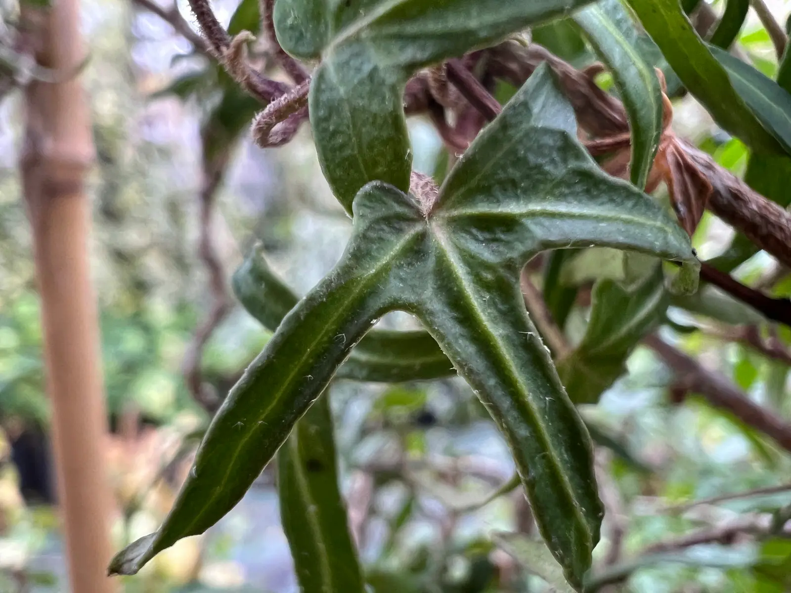 Zier-Efeu, Hedera helix ‘Tripod’, Die Blätter sind in drei sehr schmale Lappen unterteilt, die fast senkrecht zueinander stehen.