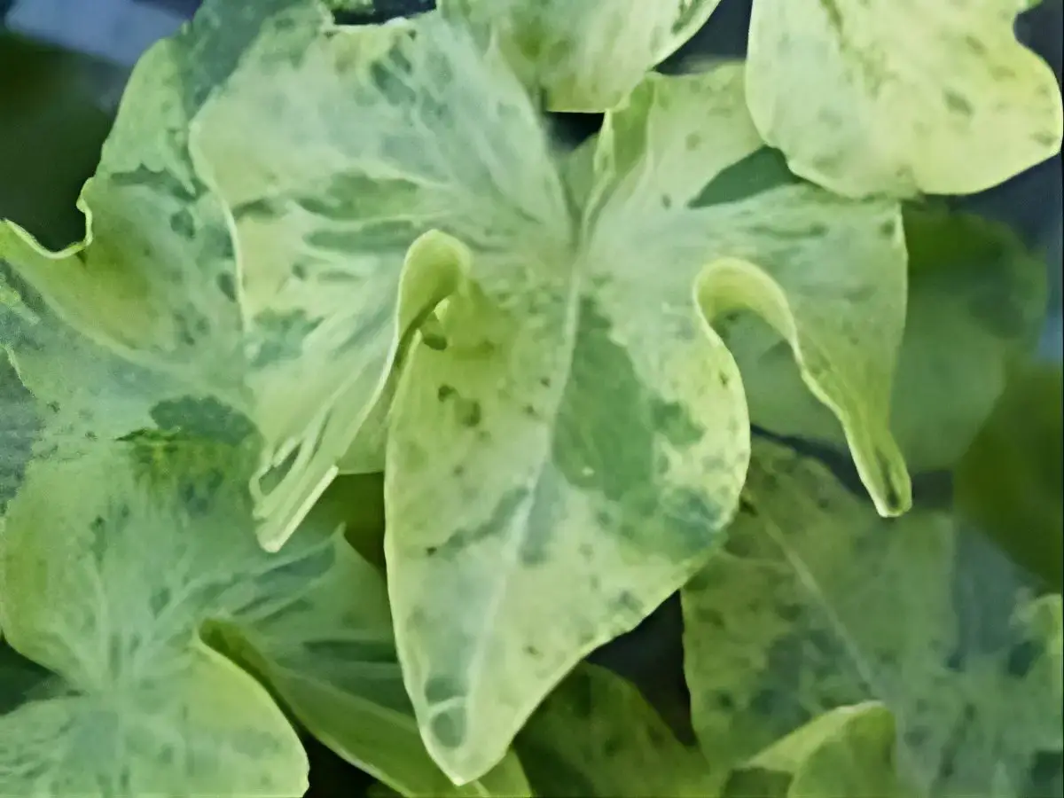 Thick, well-branched stems with short internodes, bearing leaves with 5 well-defined lobes. Marbled with creamy yellow on a light green background, the proportion of which can vary considerably. The blade is slightly wavy at the sinuses.