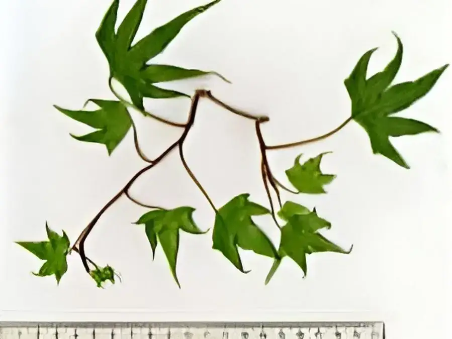 The fan-shaped leaves are deeply divided and slightly wavy at the edges. They are composed of 5 to 7 scurved, pointed, shiny light green lobes. The veins are generally parallel and clearly visible. The stems are sparsely branched and the petioles are as long as the leaves.
