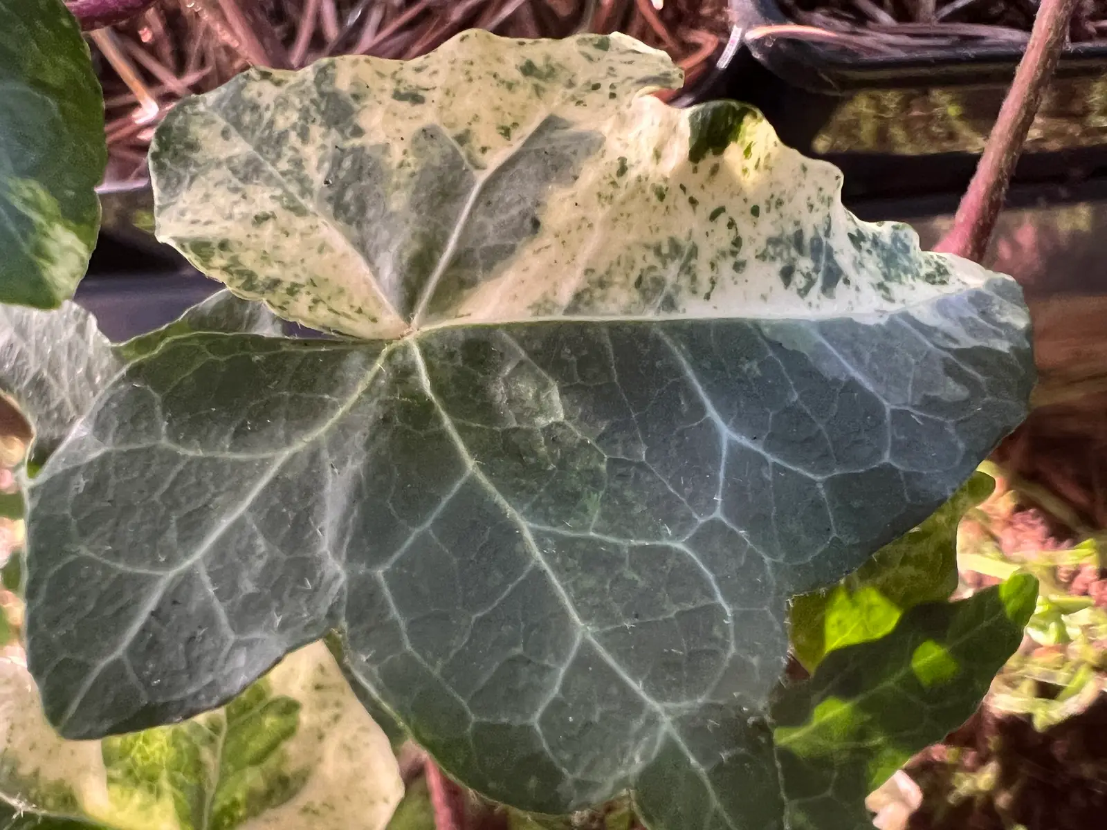 Ornamental ivy, Hedera helix ‘Discreet’, is an ivy spotted with cream, often on only half the leaf, which makes it very original.