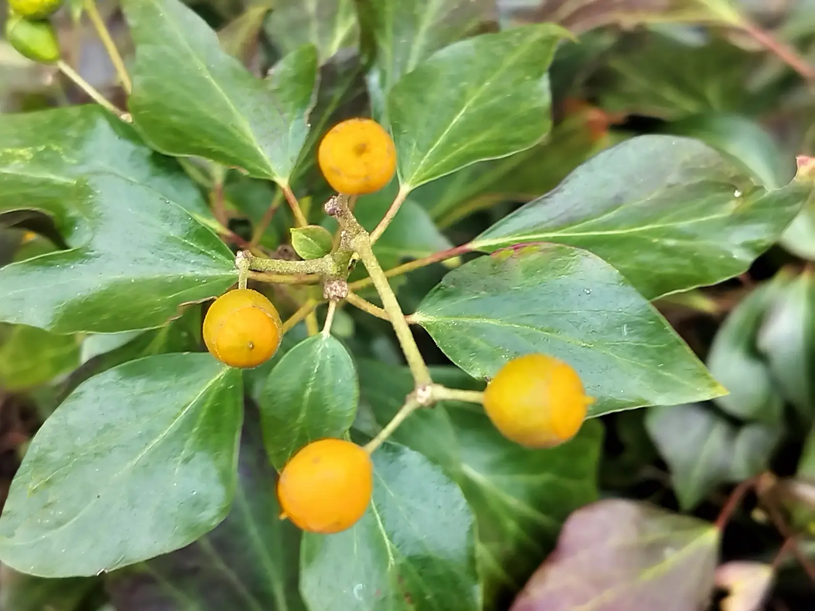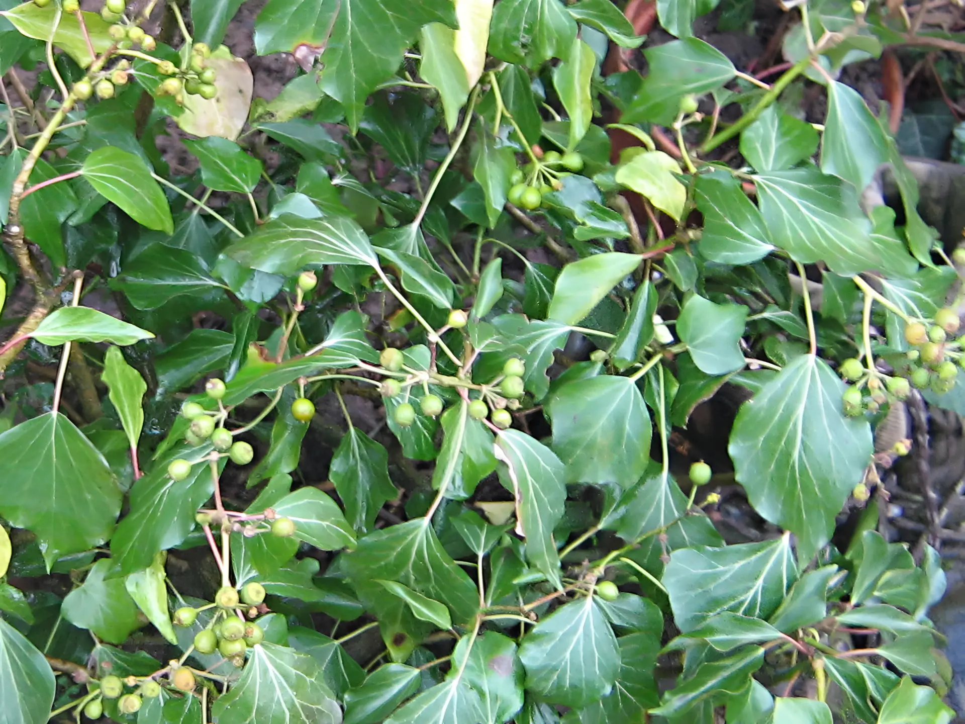 Botanical ivy, Hedera helix f. poetarum, is also known as «ivy of the poets» because it was considered more graceful and was therefore appreciated as such by poets and romantic botanists in the 19th century. It originates from the Caucasus. This is the adult form, which produces small orange fruits.