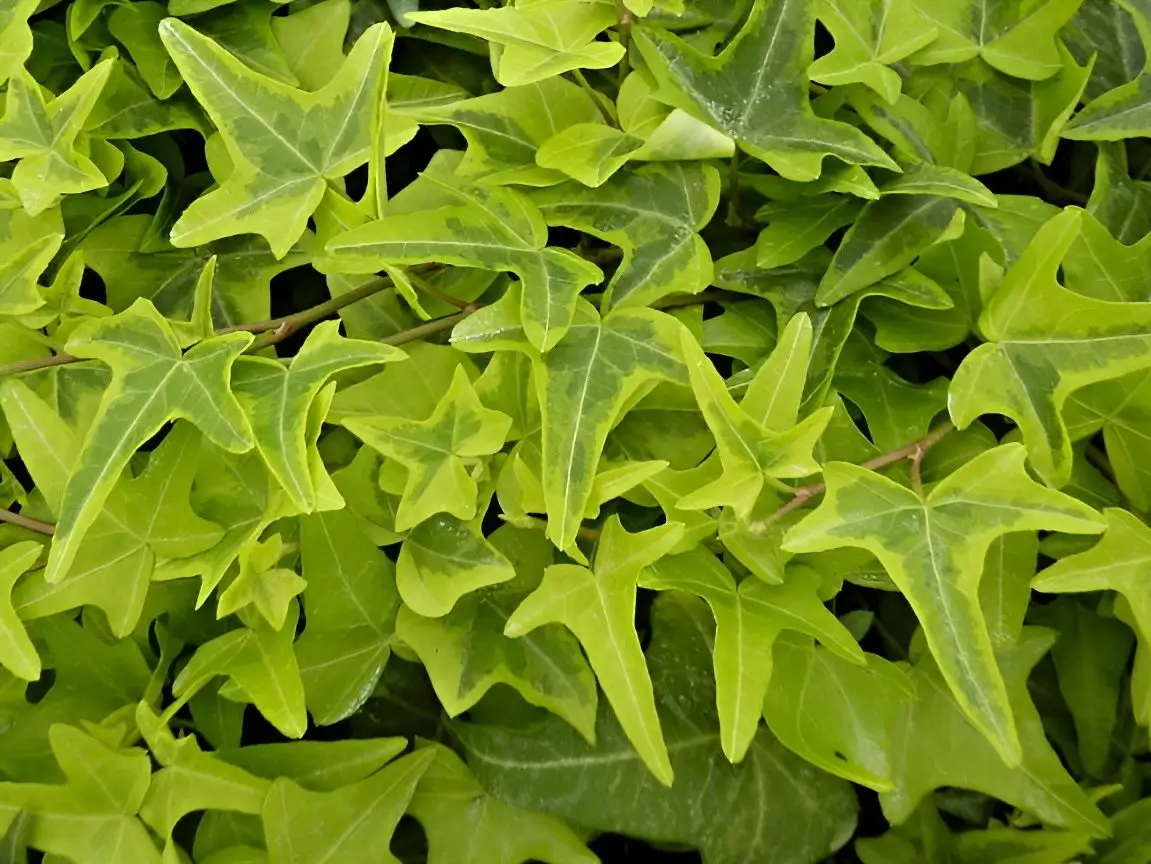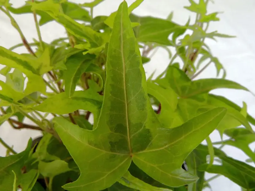 Ornamental ivy, Hedera helix ‘Goldstern’, is an ivy with yellow-green foliage criss-crossed by a striking olive-green blotch.