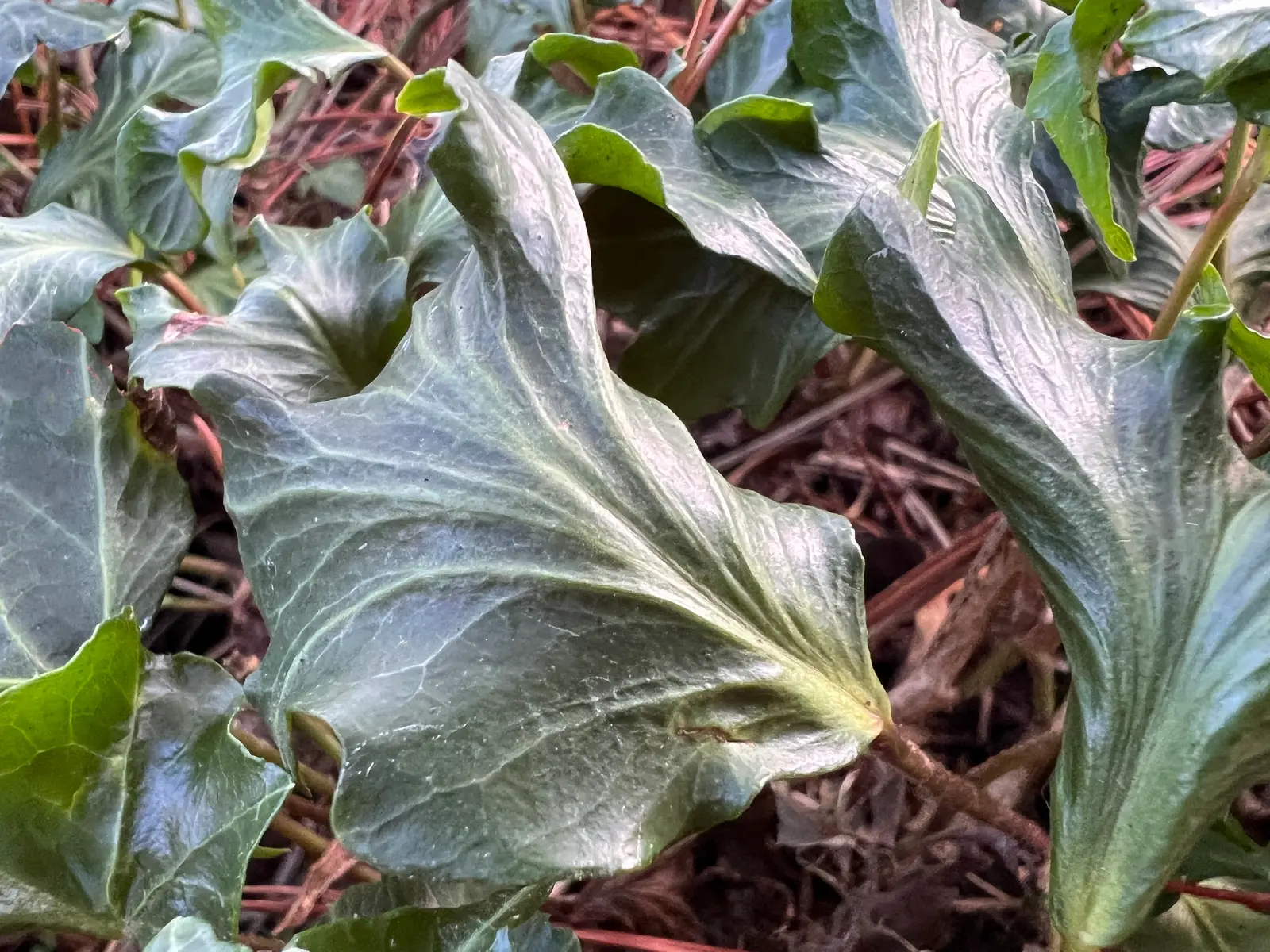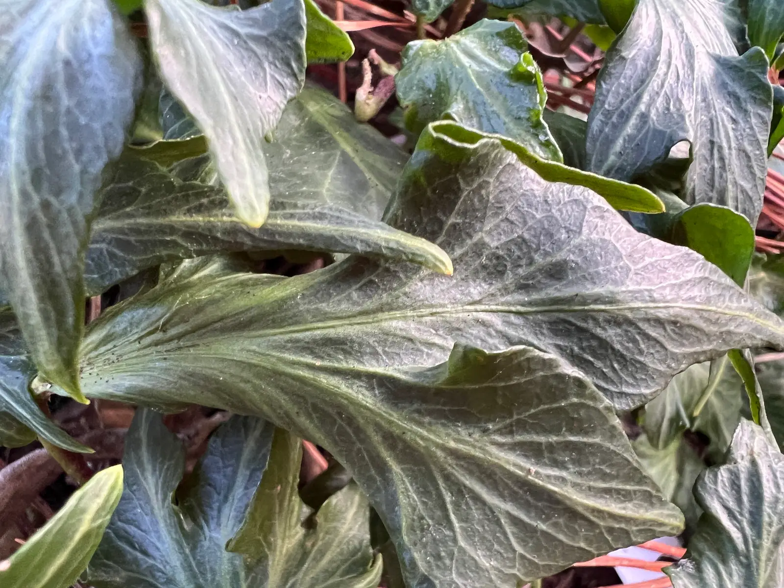 Ornamental ivy, Hedera helix ‘Green Kaleidoscope’, The leaves are convex and fan-shaped. The veins are broad, well-defined and raised.