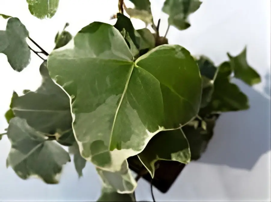 The leaf blade usually has 3 lobes, coloured grey-green with creamy white margins. The foliage takes on pinkish hues in winter. The leaves are very irregular in shape.