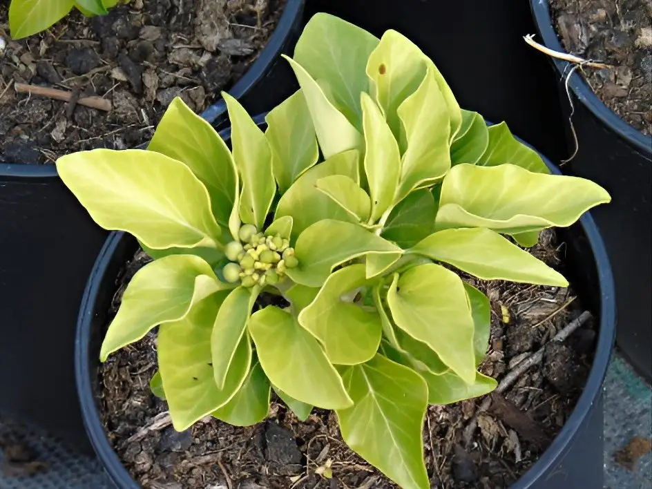 The bright green leaves are arranged around the upright stems, forming a ball. In September or October, the flowers appear in tight green umbels, attracting many foragers. The fruits, in the form of small berries, are green at first, then black when ripe. Birds feast on them at the end of winter.
