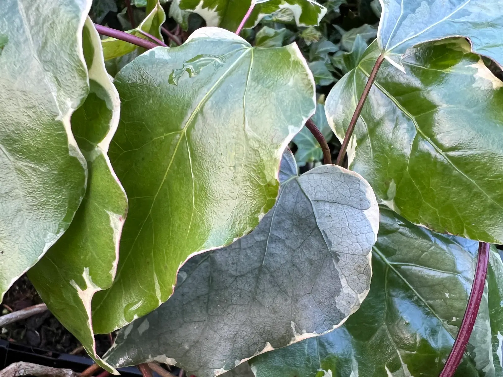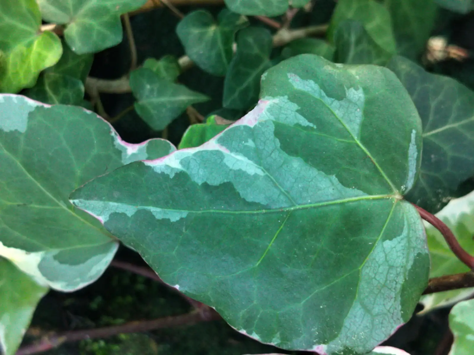 Ornamental ivy, Hedera helix ‘Ile-Grande’, It is distinguished by its very broad leaves, variegated with various shades of green and finely edged with creamy white.