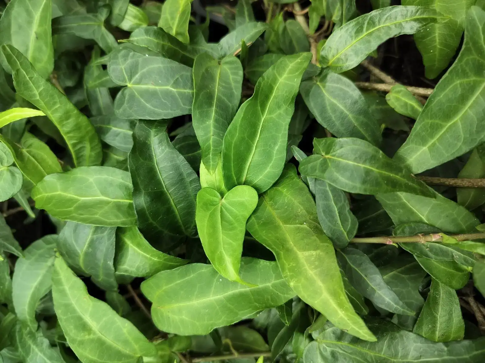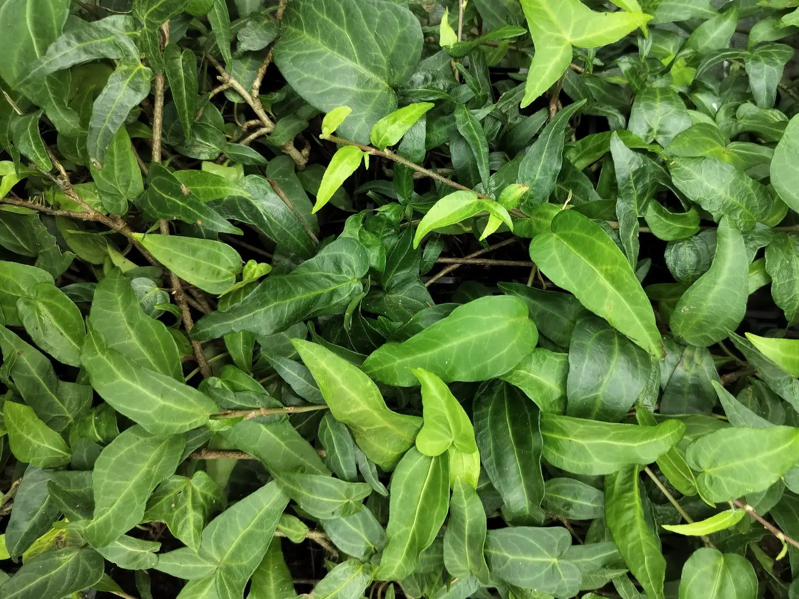 Ornamental ivy, Hedera helix ‘Liza’, is a polymorphous variety, partly resembling ‘Stella’, but regularly with long, narrow, sagittate leaves with two prominent lobes towards the base of the petiole.