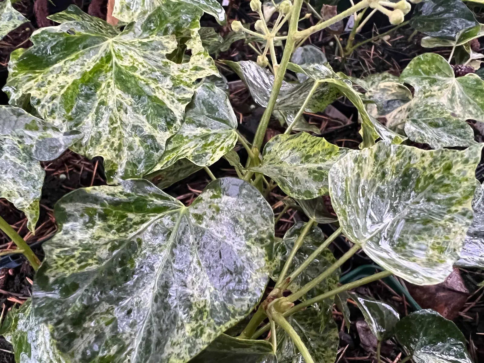 Ivy with broad, cordate leaves, attractively speckled with yellow and yellow-green.