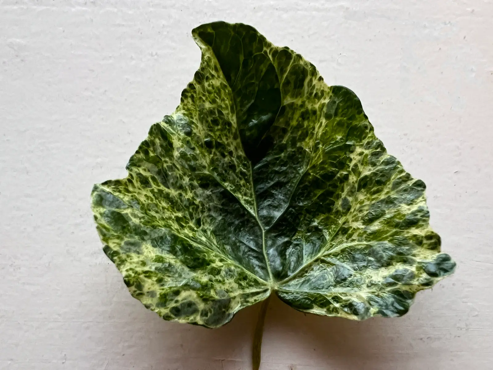 Ornamental ivy, Hedera helix ‘Luzii’ adult, Its broad, cordate leaves are attractively speckled with yellow and yellow-green.