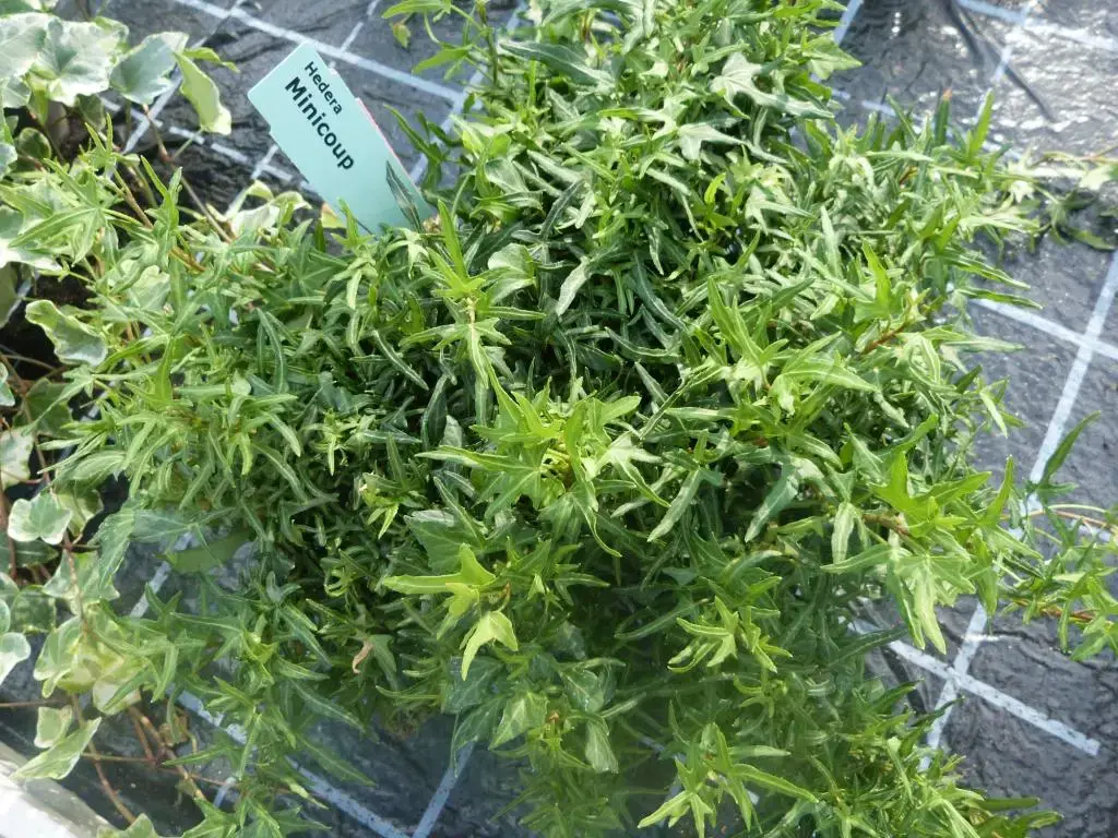 Ornamental ivy, Hedera helix ‘Minicoup’, is a highly branched ivy with long stems abundantly covered with small bird's-foot leaves.