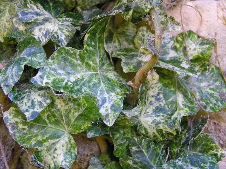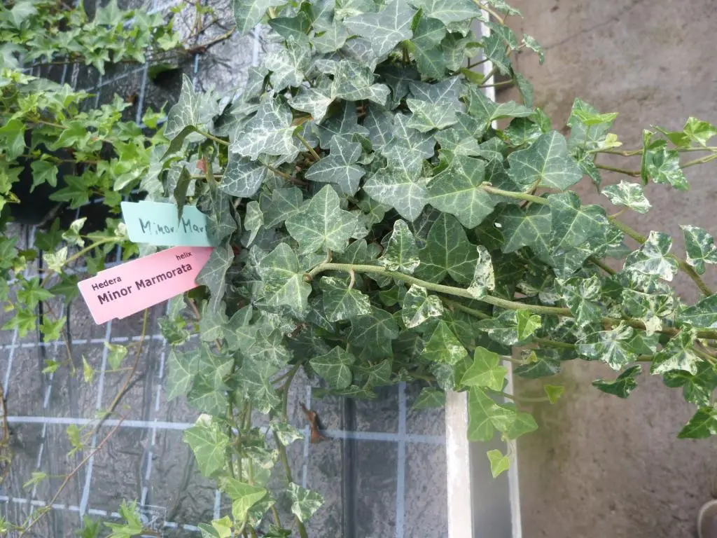 Ornamental ivy, Hedera helix ‘Minor Marmorata’, has beautiful, thick, dark green leaves splashed with creamy white. The oldest leaves are spotted white or completely green.