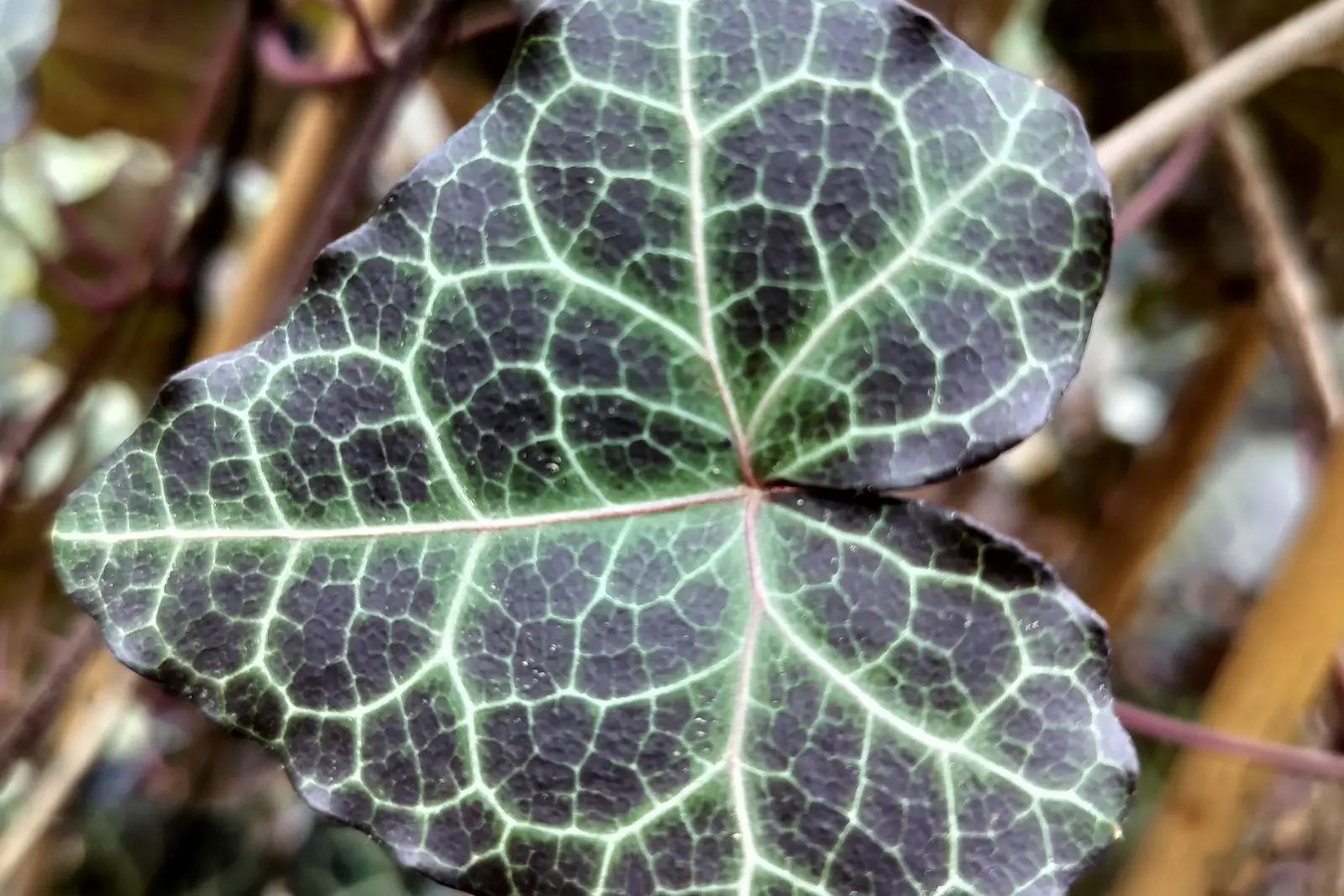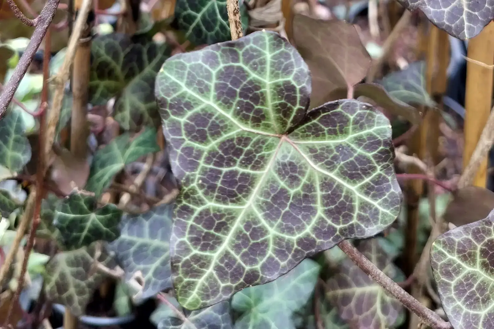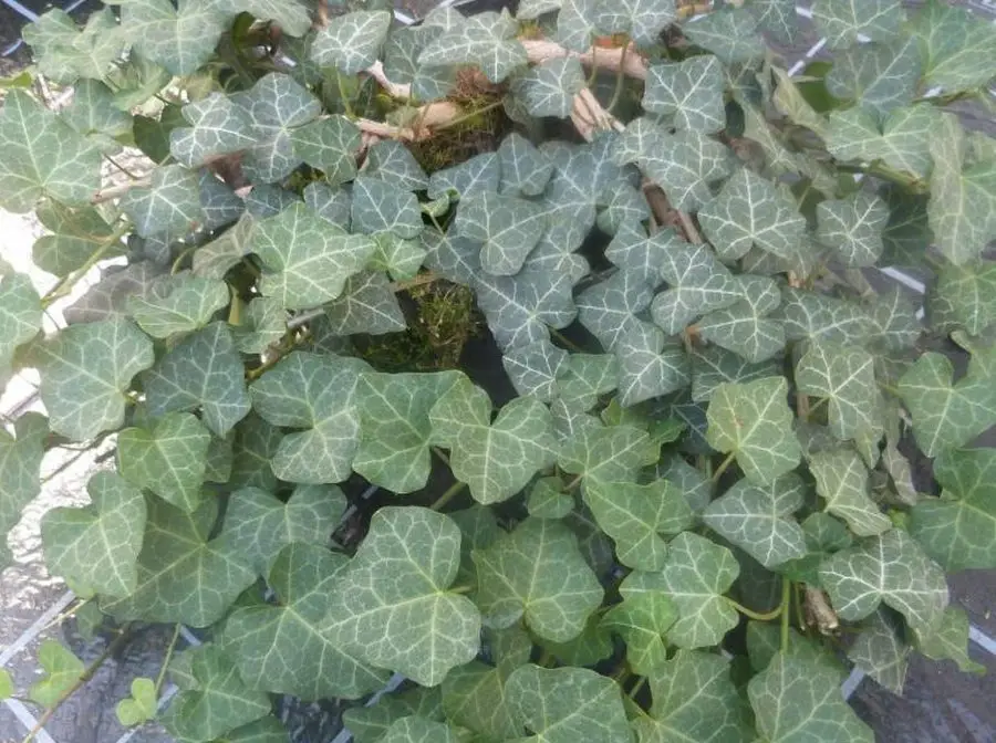 Ornamental ivy, Hedera helix ‘Modern Times’, This powerful variety has triangular, dark green foliage with beautiful white veins.