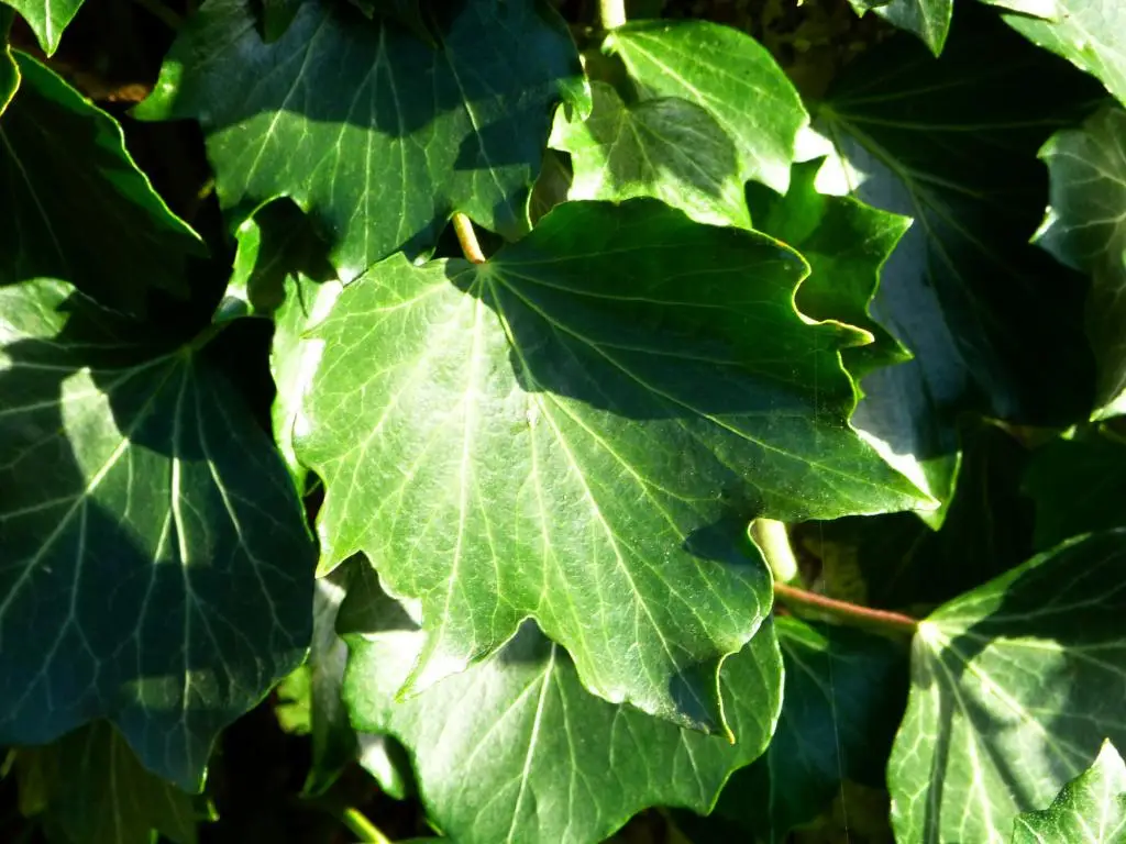 Ornamental ivy, Hedera helix ‘Palmata’, is an ivy with fan-shaped foliage. The leaves have 3 to 5 lobes with wedge-shaped outlines. The leaf blade is a matte dark green, well veined. The leaves turn yellow in winter when it is cold, and it then takes on a new colour. a beautiful purplish hue.