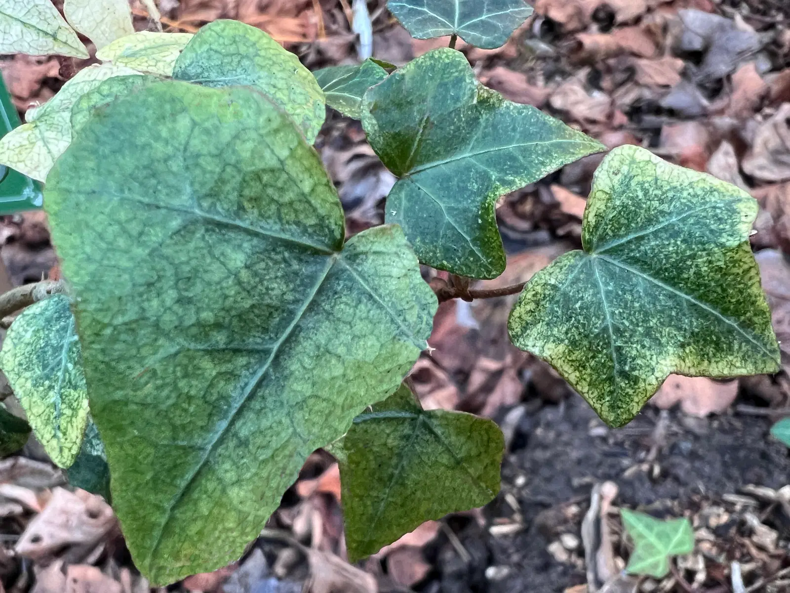 Ornamental ivy, Hedera helix ‘Pastel’,is an ivy with leaves that are more or less depigmented and finely mottled with cream or yellow-green.
