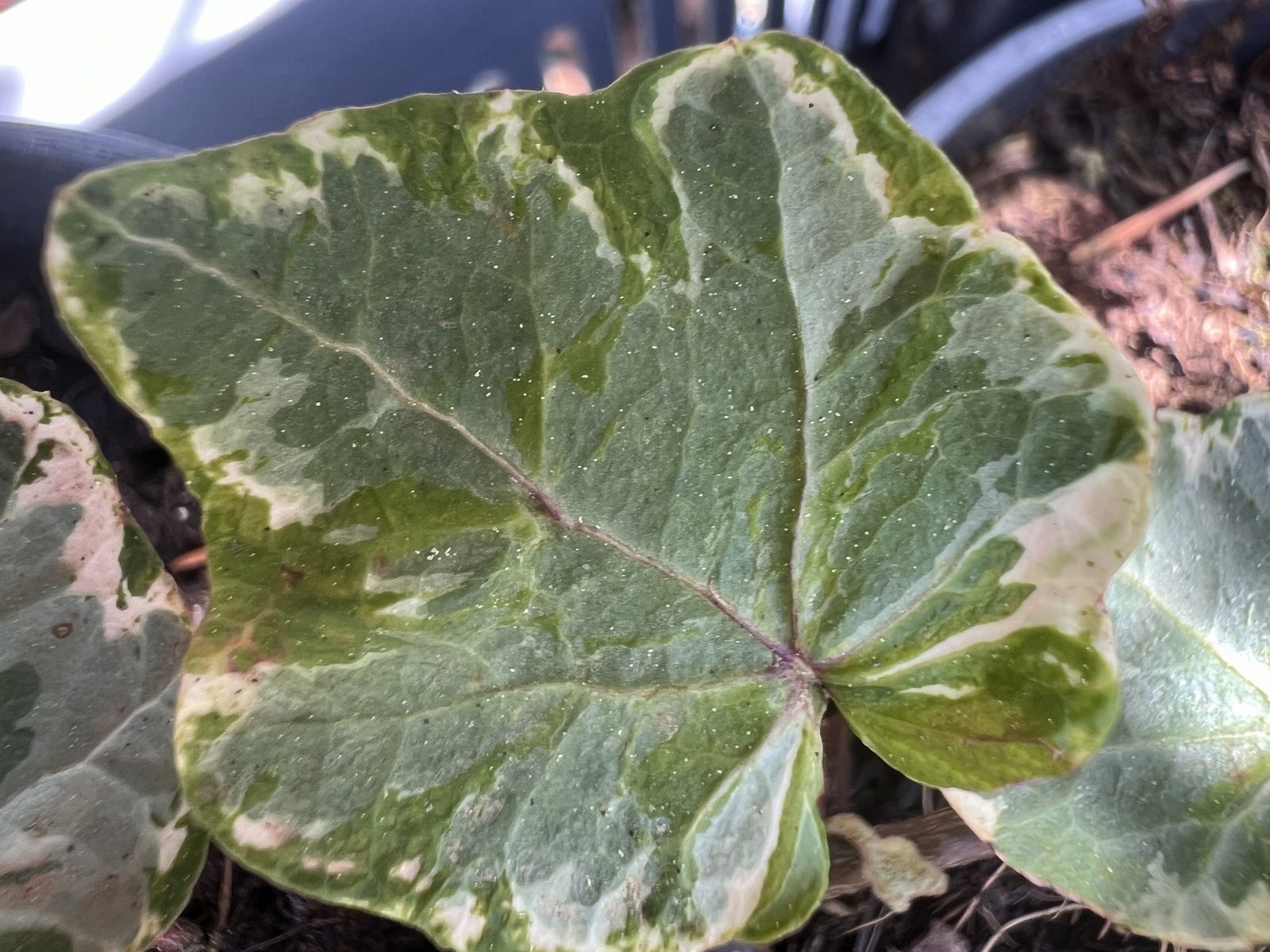 Ornamental ivy, Hedera helix ‘Pink Kolibri’, This variety has small green leaves with white and cream variegation.