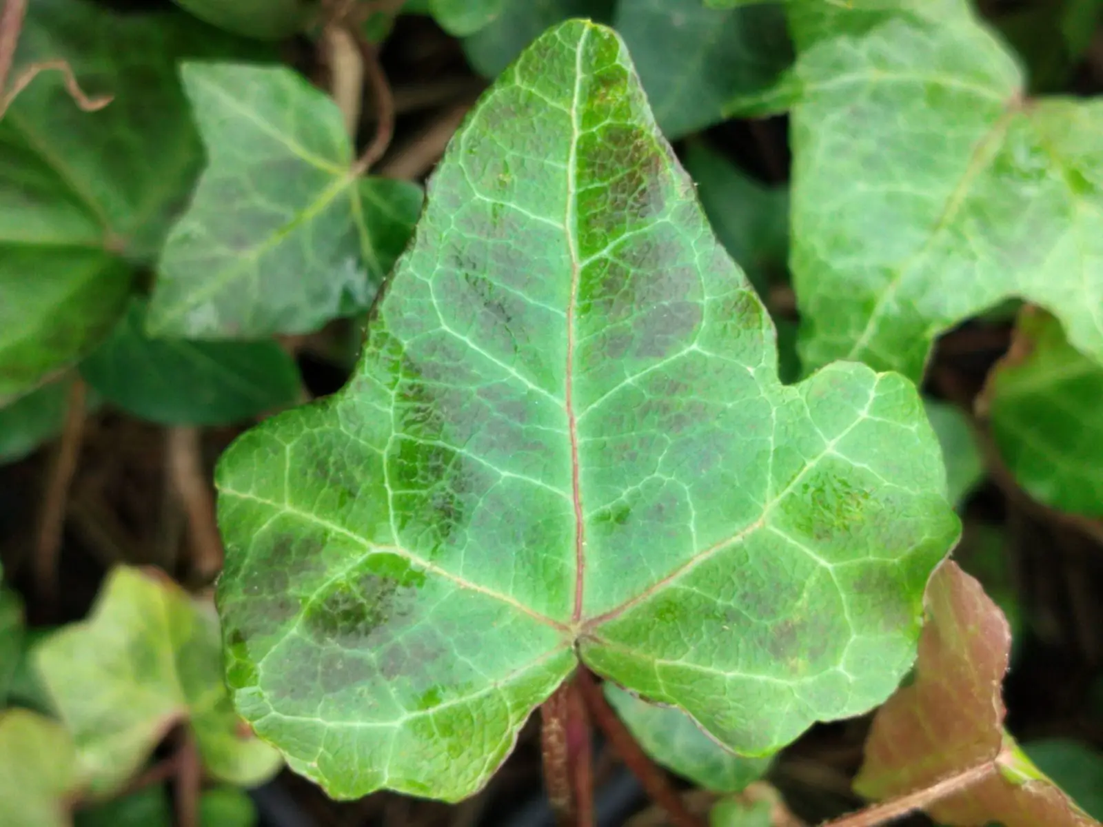 Ornamental ivy, Hedera helix ‘Steady Waves’, It has medium-green foliage, veined with red and accentuated in winter, measuring 5 cm in diameter.
