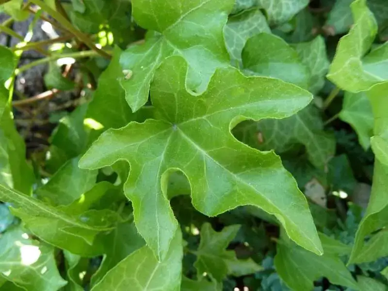 Ornamental ivy, Hedera helix ‘Victoria’, is an ivy with few branches. Its long stems bear green leaves with 5 forward-pointing lobes.