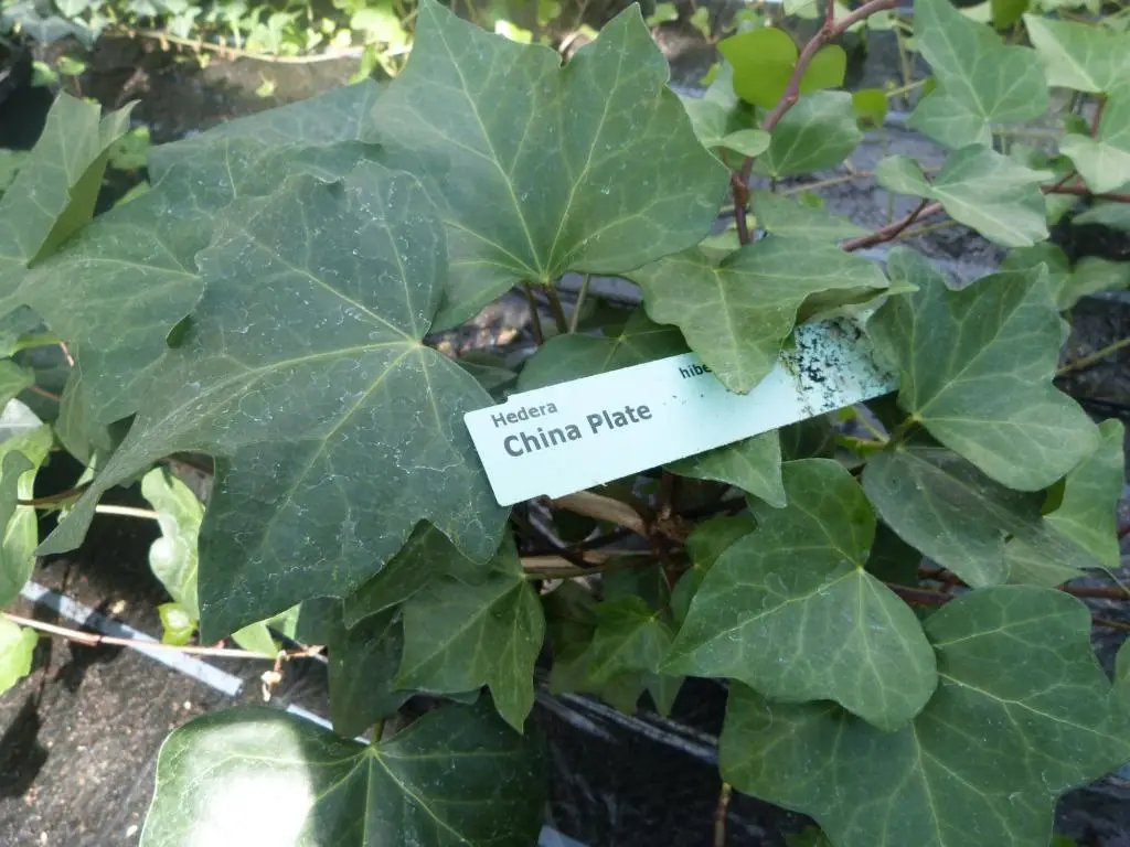 Irish ivy, Hedera hibernica ‘China Plate’, This variety has broad, curved, dark green, shiny foliage. The leaves have 3 to 5 lobes, varying in depth and usually pointed. The dark red petioles can reach 15 cm in length.