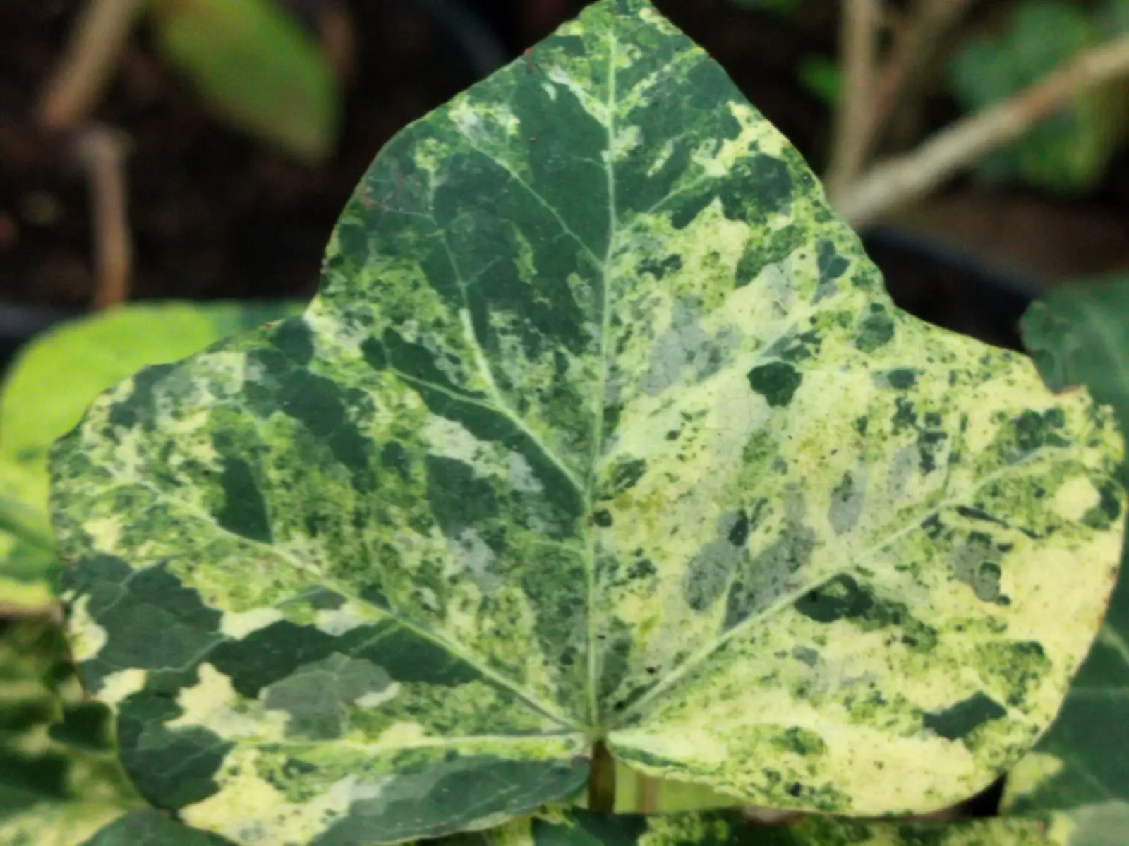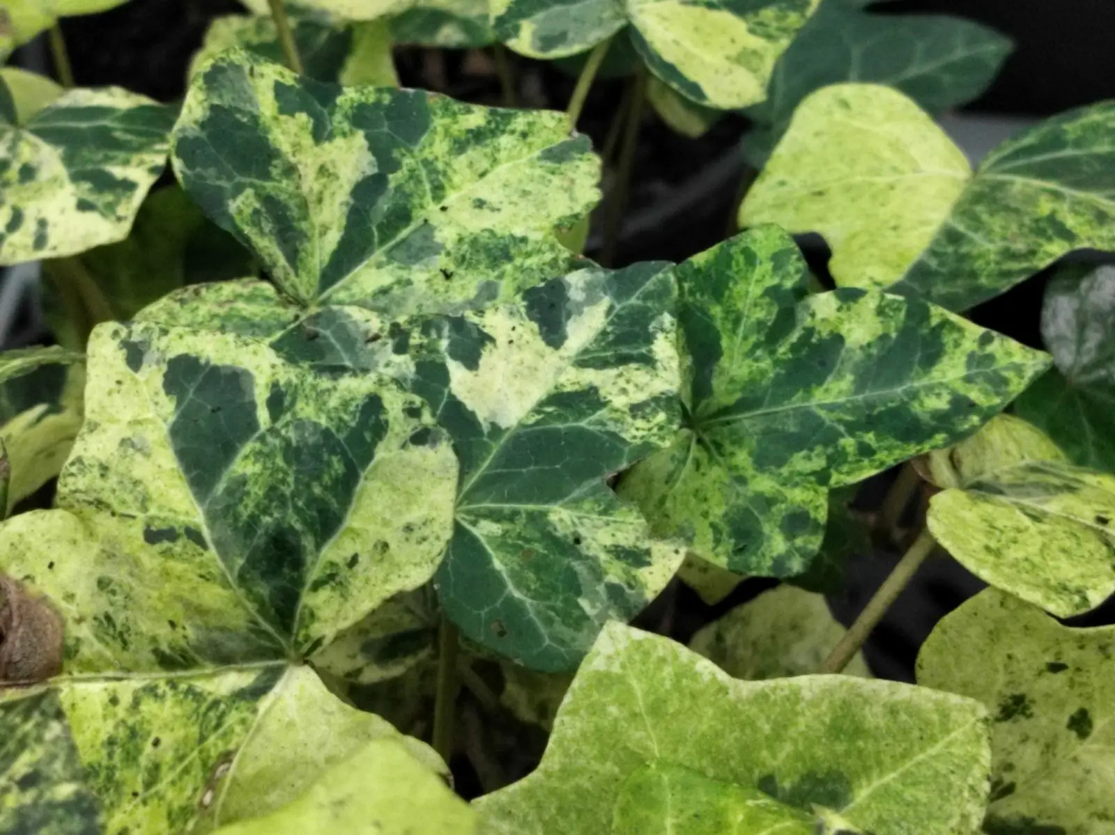 Irish ivy, Hedera hibernica ‘Sulphurea’, has asymmetrical foliage, sometimes round, sometimes lobed with slightly undulating margins. This distinctive motif is rarely lost.