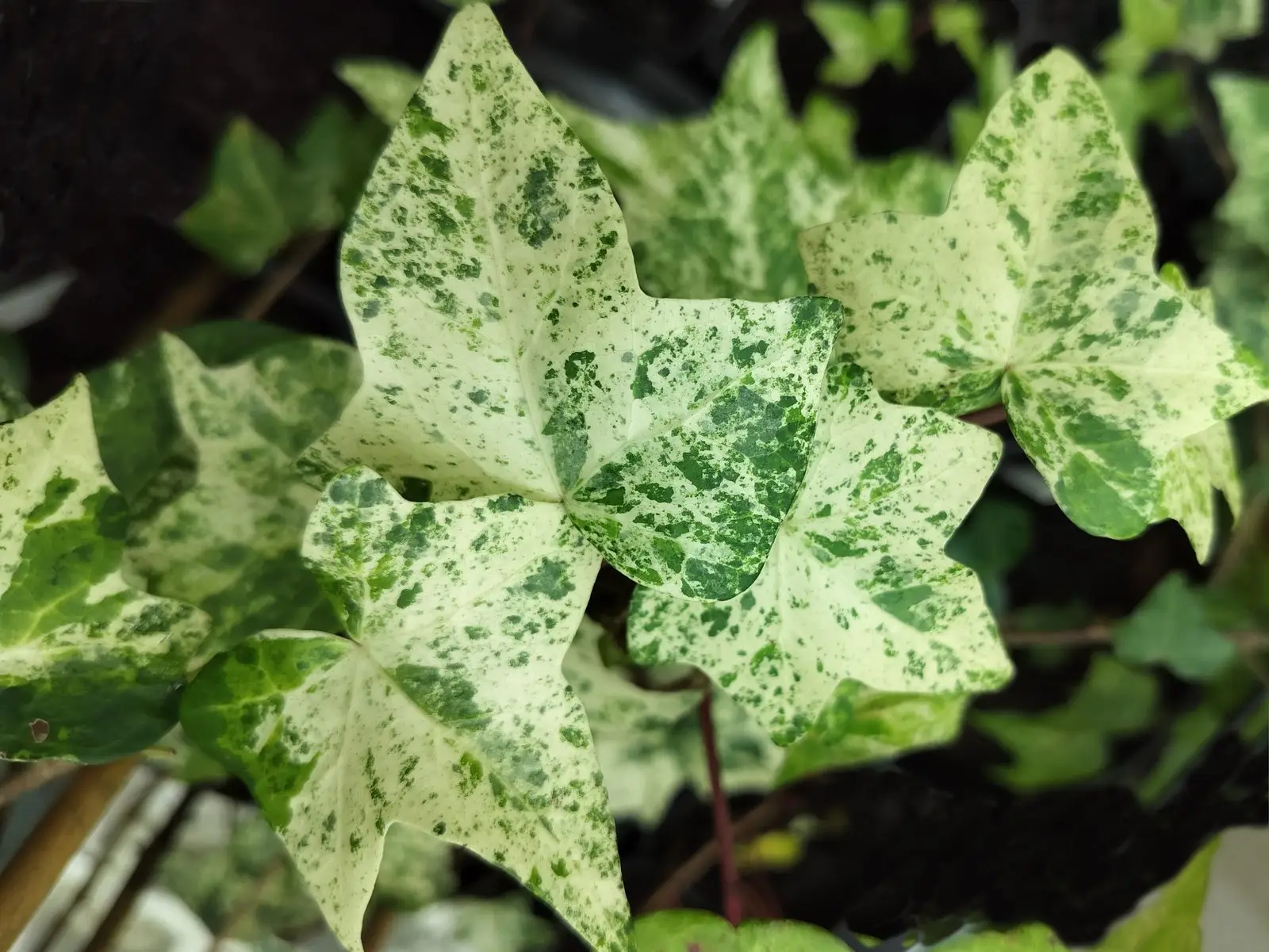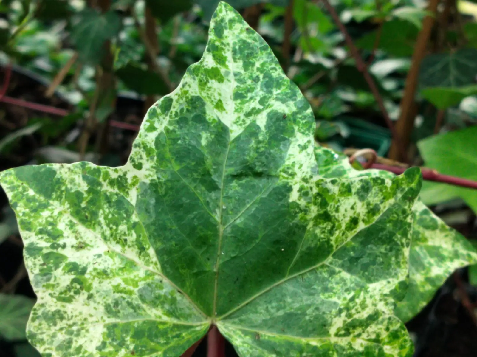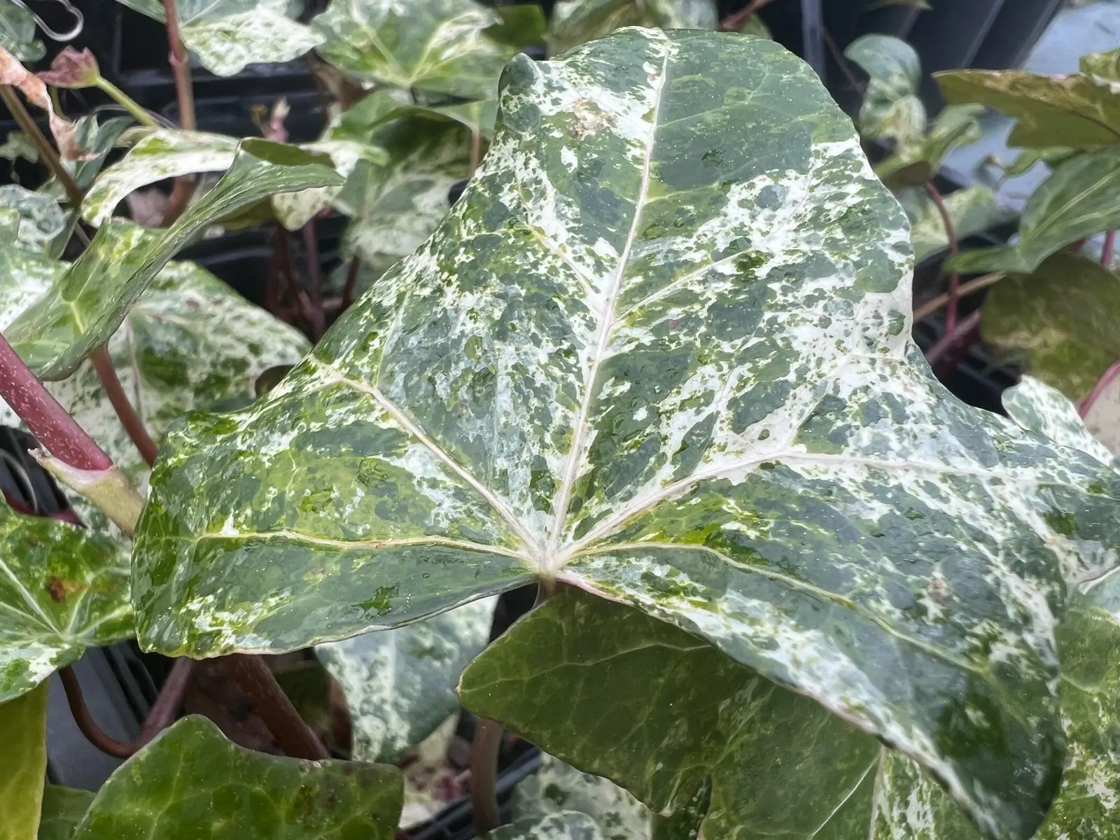 Moroccan ivy, Hedera maroccana ‘Nabar-Nabar’, Nabar-Nabar‘ has very attractive white or cream foliage spotted with dark green, with red stems and petioles. In Basque, ’Nabar-Nabar' means very variegated. This Moroccan ivy lives up to its name.