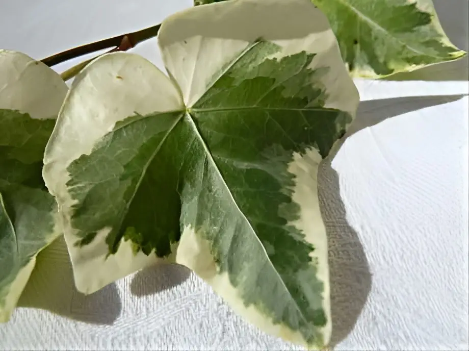 Le foglie giovani hanno da 3 a 5 lobi arrotondati all'apice, mentre quelle adulta sono a forma di diamante. La lamina fogliare è verde scuro e grigio-verde con margini color crema. Il picciolo è corto. Gli steli sono abbastanza lunghi e scarsamente ramificati.