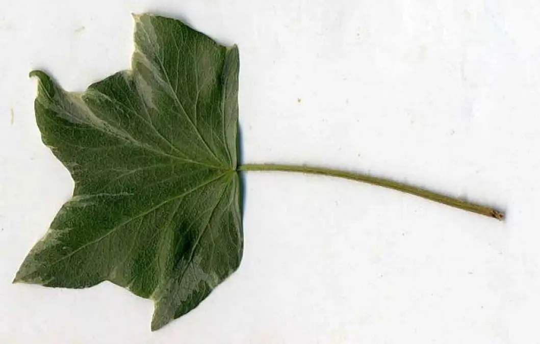 Sono variegate di verde e grigio con macchie bianche. In inverno la variegatura diventa più evidente. La lamina fogliare presenta 5 lobi irregolarmente arricciati.