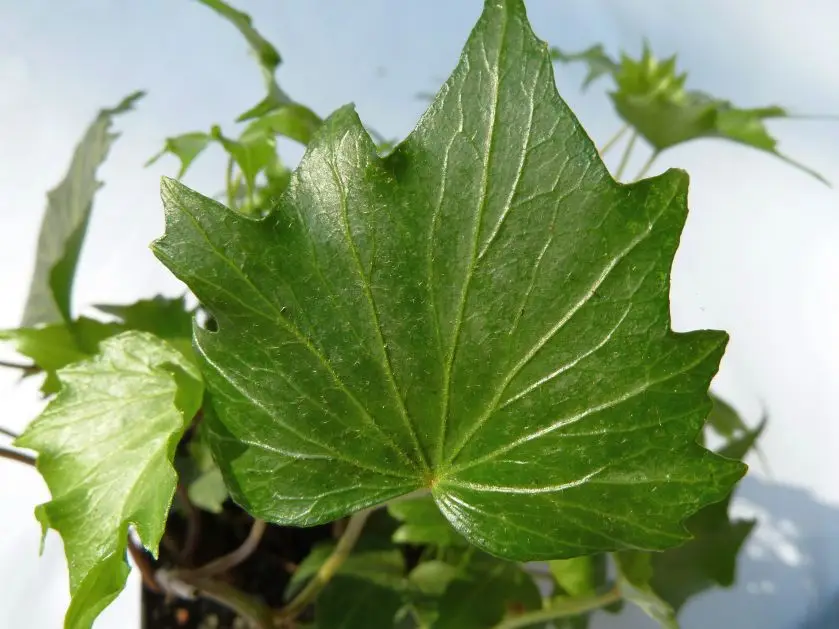 La foglia è lunga 6-7 cm, con venature sublimi e caratteristiche. Presenta da 5 a 7 lobi appuntiti che si sovrappongono e si ondulano in corrispondenza dei seni. La lamina fogliare è di colore verde medio-scuro. Gli steli sono di colore verde-rossastro, con internodi corti.