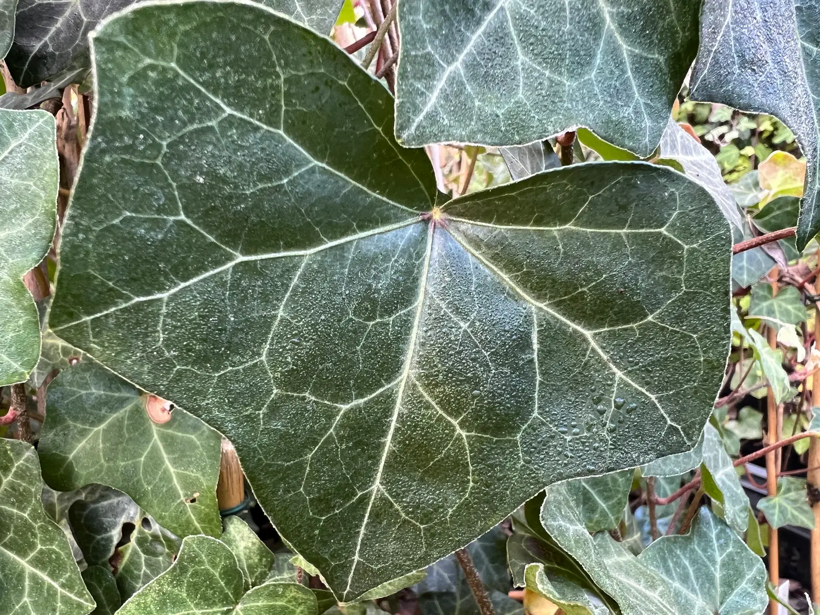 Sierklimop, Hedera helix ‘Harrison’, présente des feuilles vert foncé lustré avec une nervation bien marquée et un lobe central triangulaire.