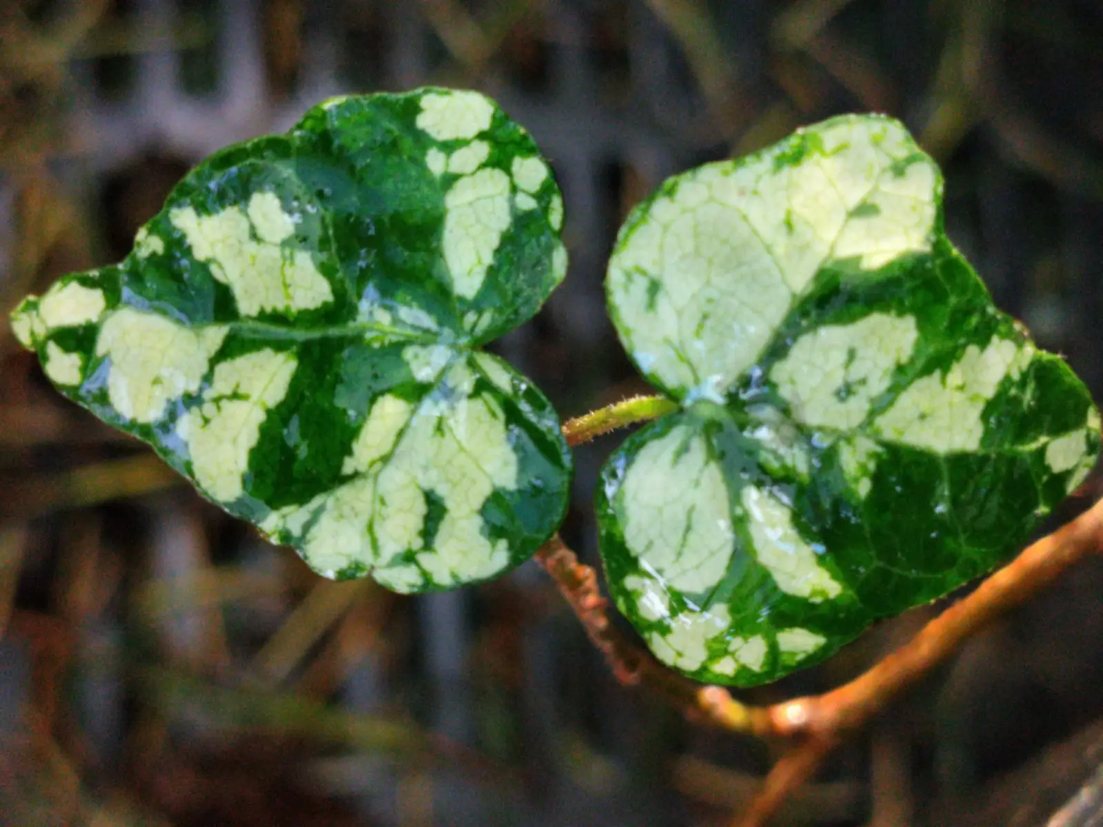 Ze zijn onregelmatig van vorm en bestaan uit 3 vage lobben. Het blad is verschillend gevlekt met wit en grijsgroen op een middelgroene achtergrond. Sommige zijn bijna wit, andere zijn wit gestreept, terwijl weer andere bijna groen zijn.