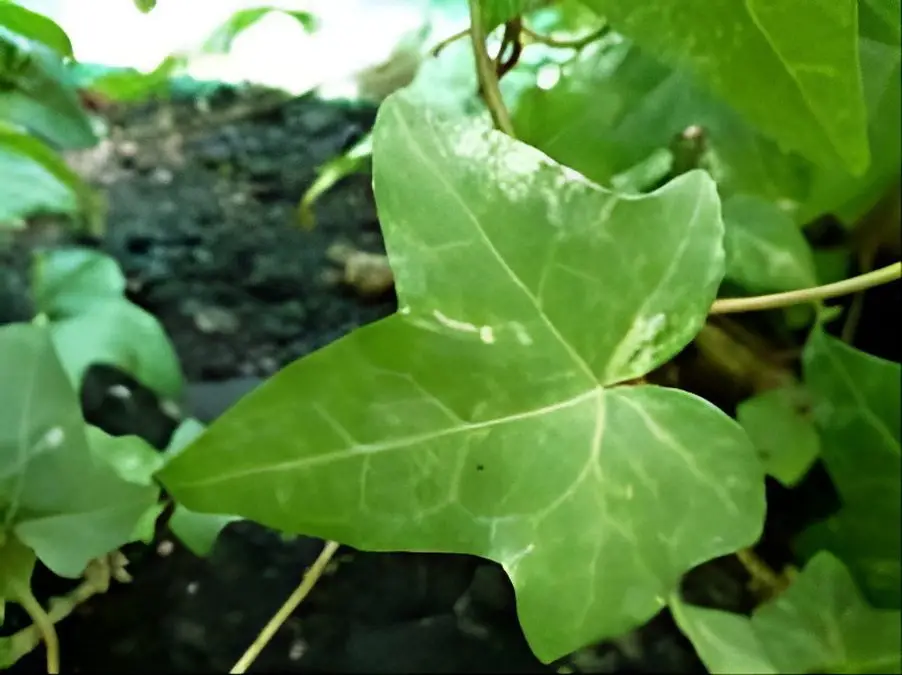 Les feuilles, de taille moyenne, sont composées de 3 à 5 lobes, le plus souvent pointus.. Le limbe est vert émeraude ponctué de vert gris et de blanc crème. Ces couleurs sont plus prononcées chez les jeunes feuilles au printemps et en situation ensoleillée. Les feuilles plus anciennes deviennent vert moyen légèrement pointillées de crème.