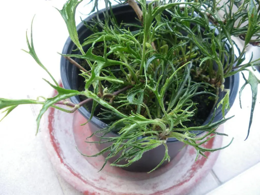 Feuillage profondément disséqué en lobes très étroits, linéaires et dirigés vers l’avant, devenant souvent tubulaires en raison des bords des feuilles enroulés vers le haut. Feuilles vert grisâtre. Base des feuilles cunéiforme étroite.