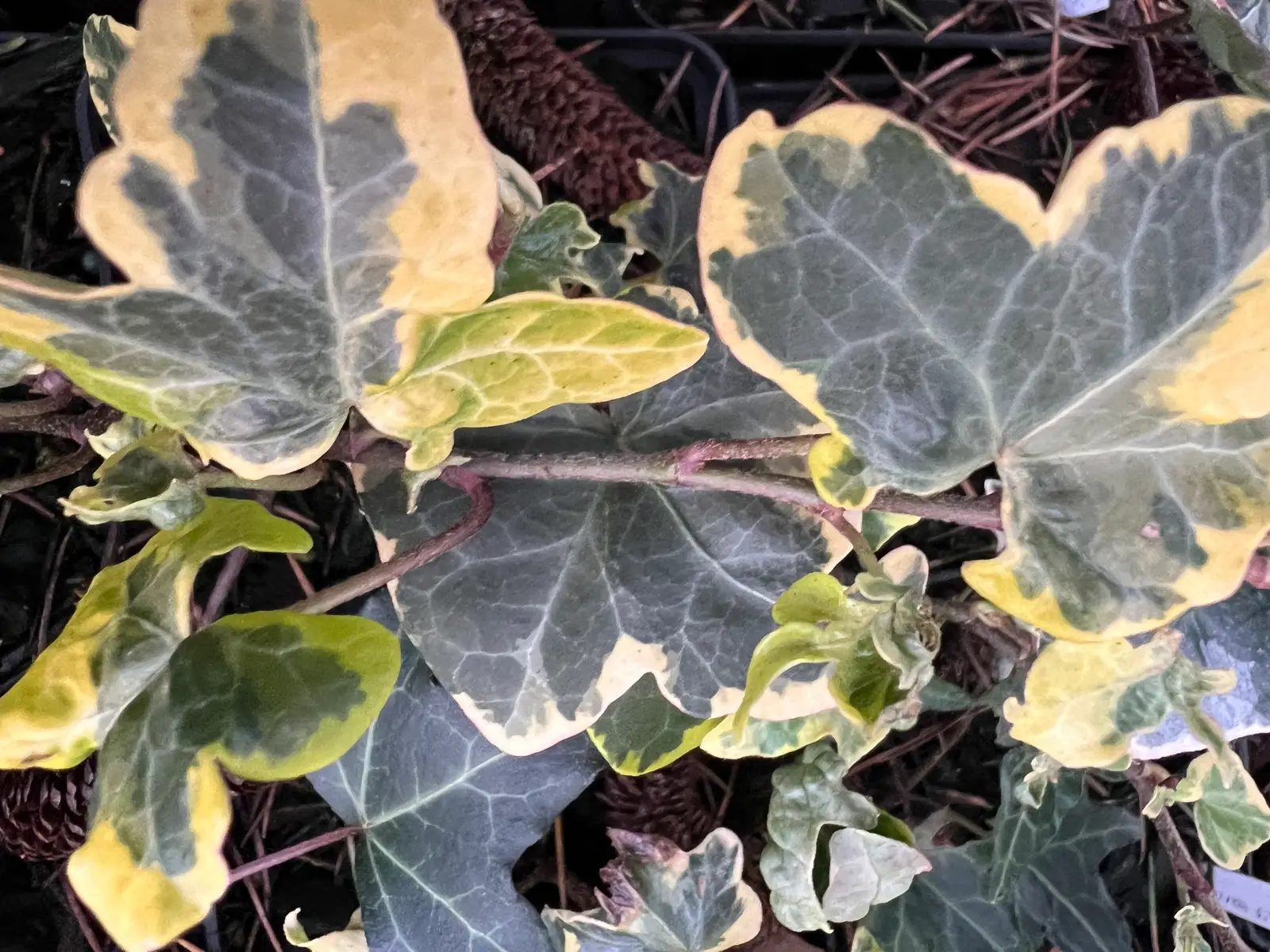 Le lierre d’ornement, Hedera helix ‘Goldlight’, présente de belles feuilles panachées de marbrures vert grisâtre, entourées de larges bordures jaune crème.