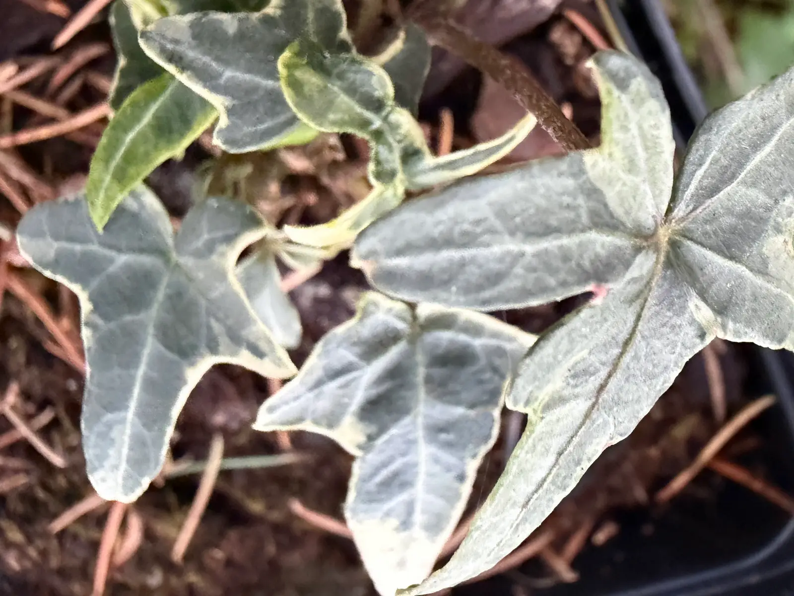 Le lierre d’ornement, Hedera helix ‘Lila’, est un petit lierre aux feuilles en pattes d’oiseau, de couleur argenté et marginé de crème.