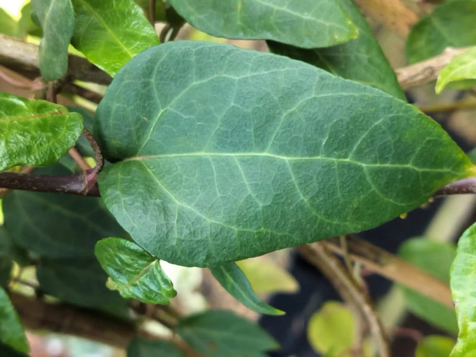 Feuillage vert foncé de forme oblongue, non lobé, joliment veiné.